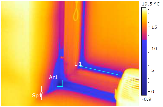 Detailní snímek pořízený termokamerou ukazuje na výrazné nedostatky v provedení tepelné izolace v oblasti okna. Levý spodní roh připojovací spáry je kritickám místem. Linie Li1 značí, že minimálně část zobrazené oblasti má povrchovou teplotu pod teplotou rosného bodu. Modře vyznačené oblasti označují plochy s rizikem kondenzace a výskytem plísní. Označenými místy také uniká z bytu tepelná energie.